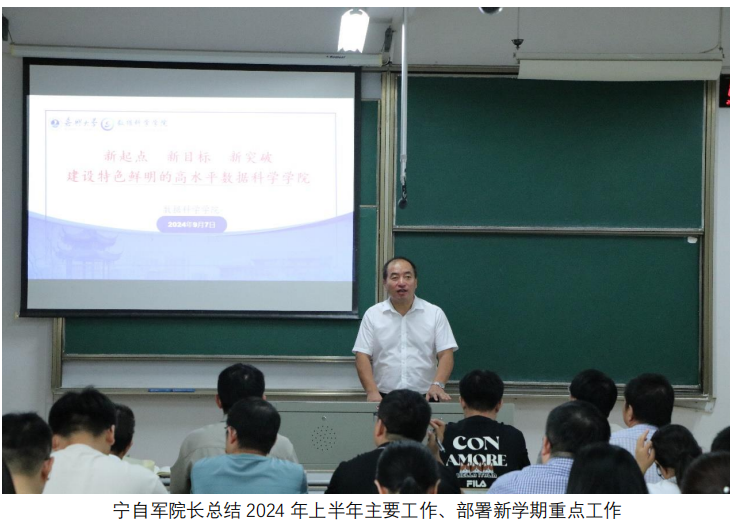 会上,学院院长宁自军传达了党的二十届三中全会、学校全面深化改革会议暨2024年暑期中层干部(扩大)读书会等会议精神,盘点回顾了上半年工作任务完成情况,并对下半年重点工作进行了布置。他指出,站在建设有特色善创新综合性高水平大学发展新起点,面对学校办大学向学院办大学转变新形势和学校“冲A、拼‘博’、建一流”的新目标、新定位,希望全院教职工进一步统一思想、凝心聚力、团结奋进,以优秀的工作业绩圆满完成全年工作任务。