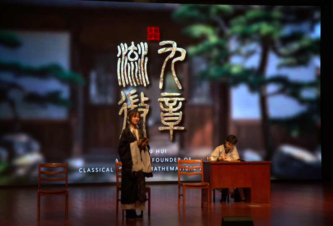 话剧《徽注的世界》由“中学生的思想镜像”与“徽注的世界”两条脉络构成,两条故事线互为对偶,相互补充,将中国古代数学家刘徽的数学思想呈现给大众。演出现场,主创们的精心构思和演员们精湛的表演,在现实与虚幻的转换中带领观众一同前往刘徽《九章算术注》的世界,以精彩的演出致敬中国古典数学的主要奠基人刘徽。