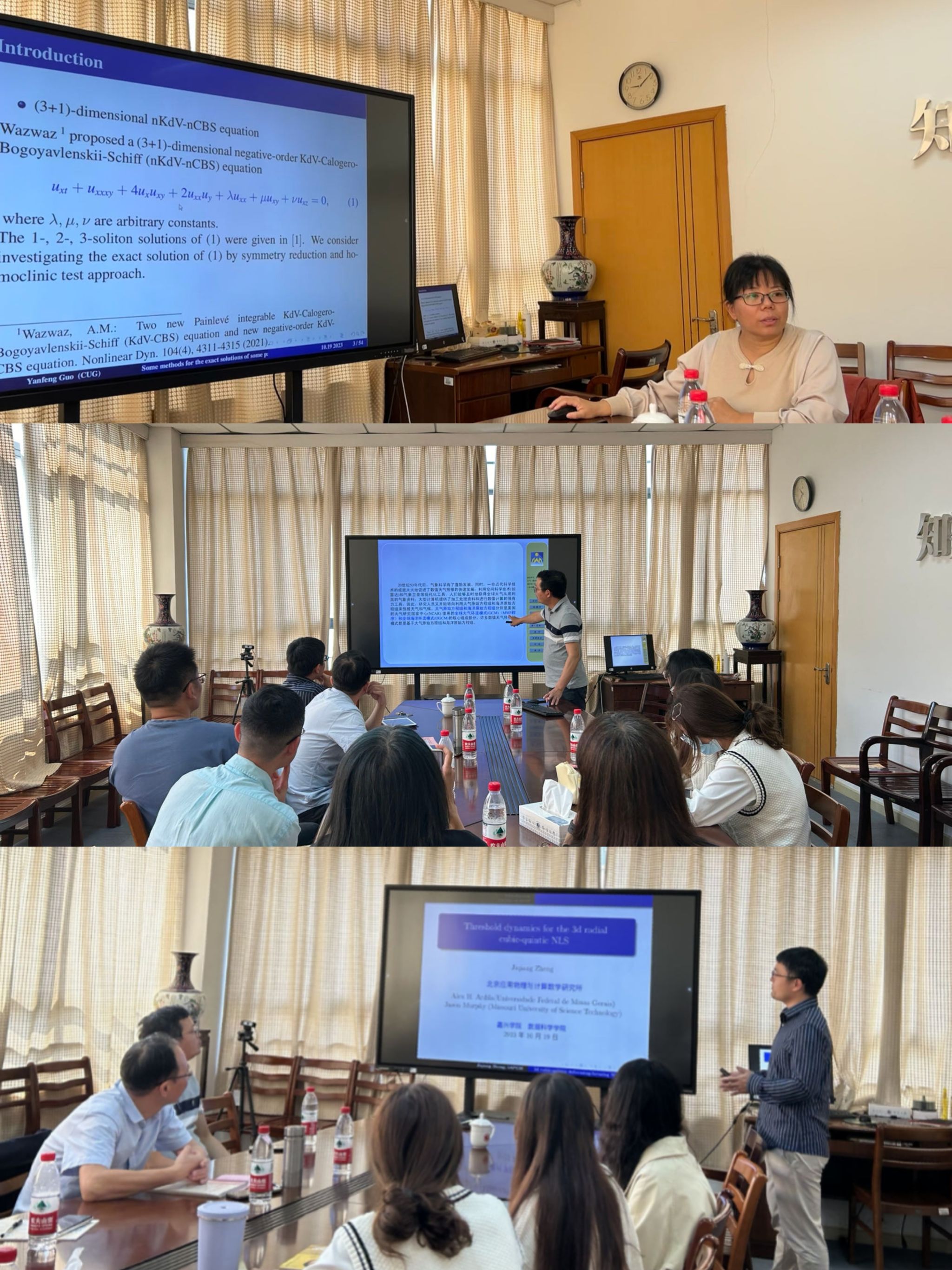 郭艳凤教授介绍了求解微分方程精确解的一些最新方法,如Lie群对称约化法、Homoclinic测试函数法、三波法、参数极限法等,并讨论了kink孤立子、lump孤立子, Y孤立子等精确解。黄代文研究员介绍了大尺度大气海洋方程组数学理论的研究进展,包括解的整体适定性、长时间动力学行为以及整体吸引子的存在性等问题,同时介绍了该领域的一些前沿研究问题及最新进展。郑继强研究员介绍了带有聚焦五次项与非聚焦三次项相组合的非线性项的Schrödinger方程解的性质,特别是对H1能量解给出了散射与爆破的端口分类准则,同时也介绍了该领域的一些公开问题及其进展情况。