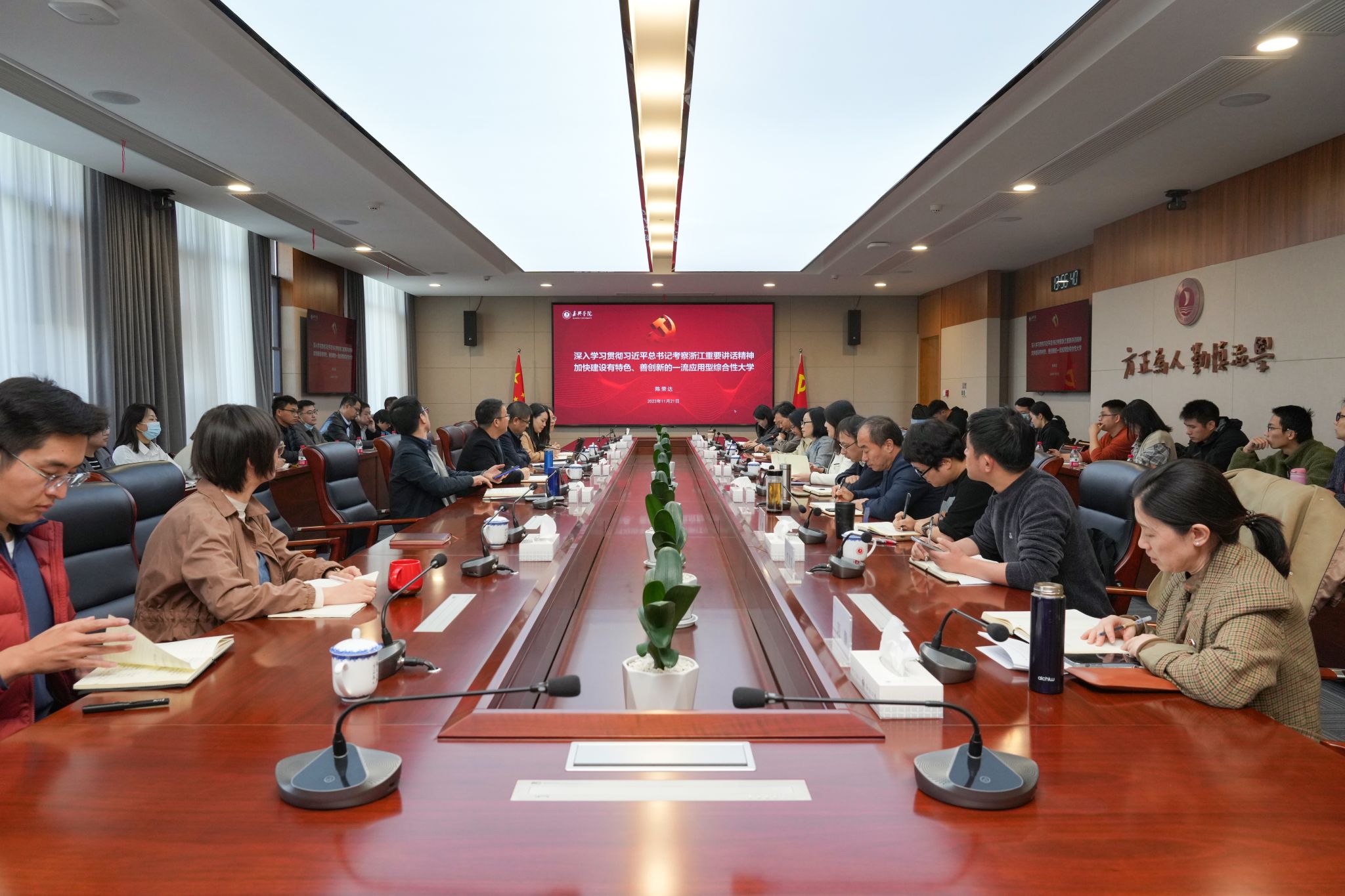 11月21日下午,副校长陈荣达为师生作习近平总书记考察浙江重要讲话精神专题宣讲。机关、商学院、3044永利集团官网党委理论学习中心组成员及相关师生代表参加宣讲会。