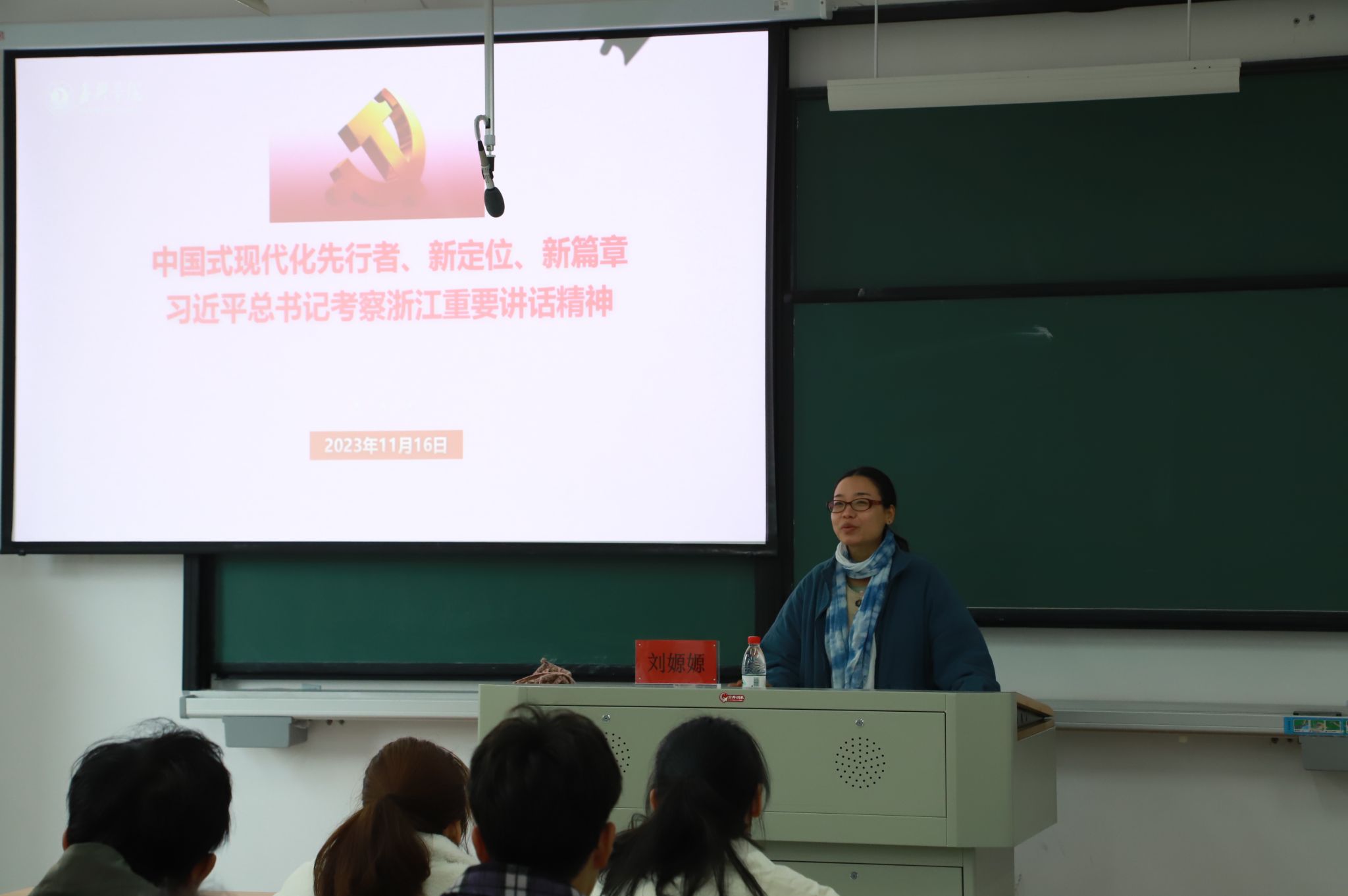 刘嫄嫄以《中国现代化先行者、新定位、新篇章——习近平总书记考察浙江重要讲话精神学习》为主题,为同学们详细介绍了习近平总书记在浙江考察调研的足迹、传达省委贯彻落实重要讲话精神的意见,并从青年大学生的角度阐释浙江先行走向中国式现代化的新定位、新篇章。