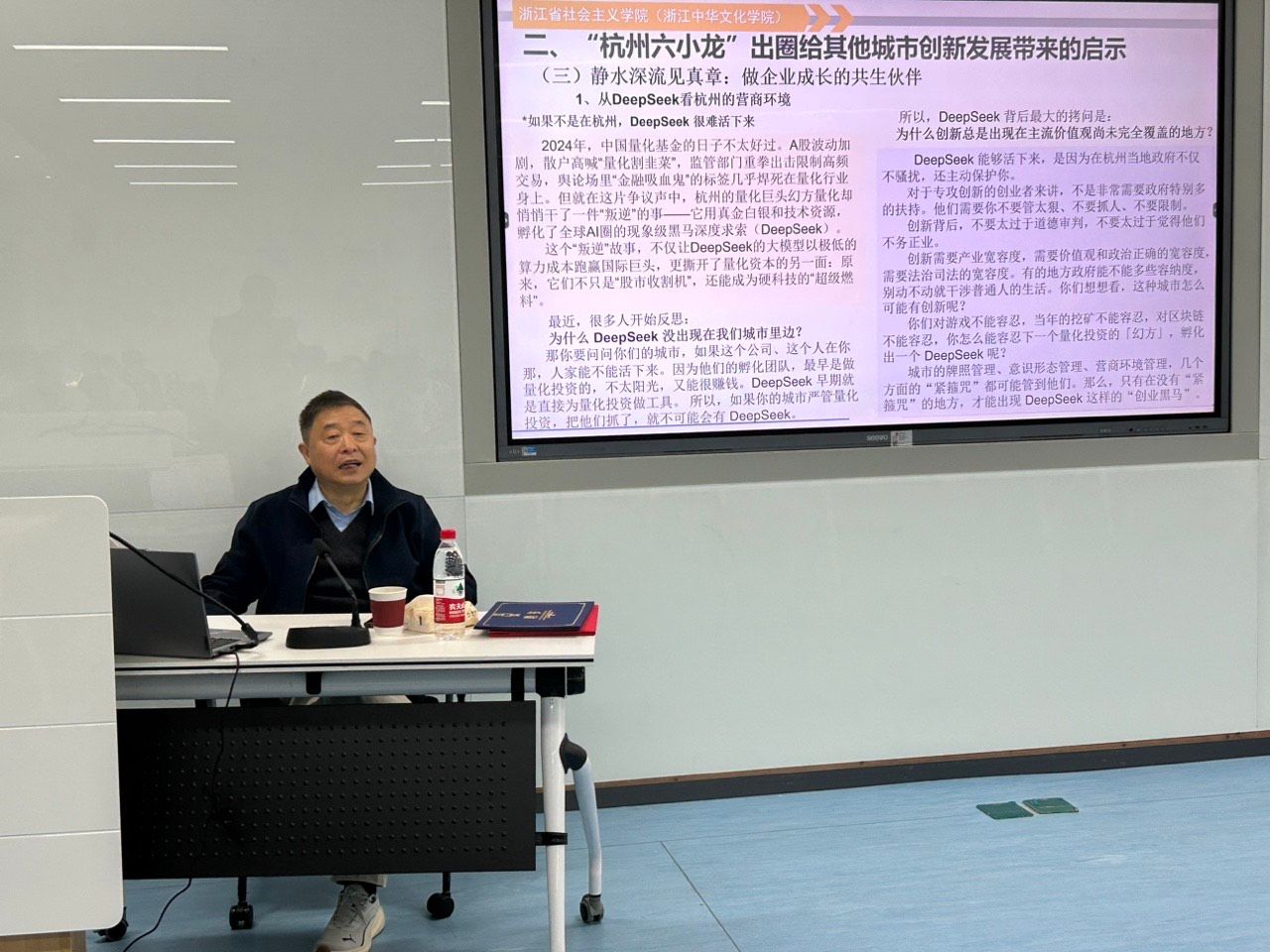 隗教授结合全国“两会”期间习近平总书记和李强总理关于民营经济发展的重要讲话,强调“英雄不问出处,创新涌现而非设计”,倡导构建“亲清”政商关系与“无感服务”式营商环境,并勉励青年学子勇于投身创新创业实践。