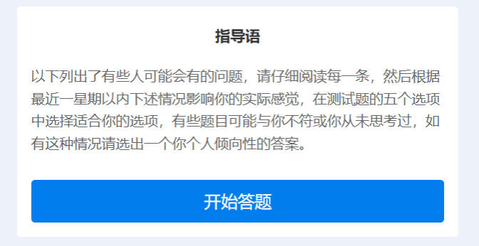 1、本次测量只是了解您近期的心理状态,每道题的答案无所谓对错。在测试过程中,不用过多考虑应该怎样,也不要与他人商量讨论,只需根据自己的真实情况凭第一感觉回答即可。学校会对您的测试结果保密。
